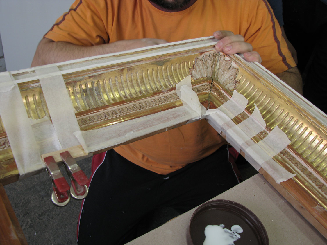 Dar sa revenim la repararea insertiei faramate. Dupa curatarea sparturilor respective de praf si oxizi, am folosit acetatul polivinilic (aracetul) pentru a reatasa ferm acele parti de corpul ramei. Daca dorim sa fim extrem de rigurosi, putem folosi cleiul de oase pentru aceasta operatie, acesta fiind adezivul predilect al vechilor rameuri. Cleiul de oase este insa un adeziv reversibil la umezeala si caldura iar lipitura noastra era una extrem de fina, usor de ruinat pe parcursul procedeelor umede succesive de refacere a suprafetelor reparate. Aplicarea catorva straturi de gesso sotile ar fi reactivat cleiul de oase din lipitura cu consecinta ca partile lipite cu truda si migala s-ar fi putut desprinde. Pentru a evita acest risc am preferat sa folosim aracetul, un adeziv care, desi poate fi subtiat cu apa, devine insolubil dupa uscare.